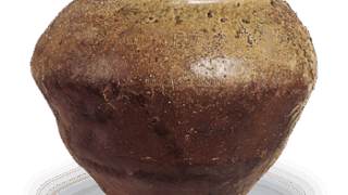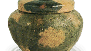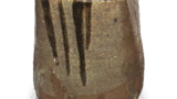 This jar is modeled after a Lu-Song tea jar and was clearly made as a tea jar. The body is beaten, leaving marks on the surface, and the three sides of the shoulder have horizontal ears with double black lines around them. The body is covered with a black ame glaze from the mouth to the hem, but the glaze has been splattered due to the raw glaze, revealing the reddish clay. The fact that it has ears on three sides instead of four is characteristic of the Karatsu style. It is assumed to have been made by the Tani Kiln of the jar shop.