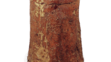 This cylindrical vase is wheel-thrown with a slightly widened base. The mouth is tightened and stepped, and the inwardly tapered rim is in the style of an ubakuchi. The relaxed hanging ears on both sides of the shoulders are in perfect harmony with the overall shape of the vase, giving the vase a refined and dignified appearance. The clay surface is soft and burnished to a grayish-black color, which contrasts sharply with the reddish surface of the upper right part of the pot. Bizen ware with such a soft texture is relatively rare. The front and back sides are carved vertically and horizontally with spatula carvings, but this is a very gentle piece of tea ceremony ware of this type from the Momoyama period. The bottom is flat and gently undulating. The inscription of “Fukumimi” is probably a reference to the shape of the ear. There is a small hole with pig iron on the shoulder on both the front and back, but it is probably a filler now. It was probably made during the Tensho period.