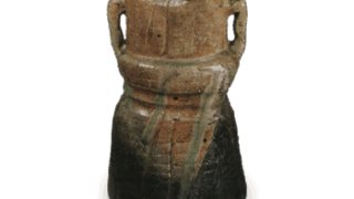 This is a cylindrical flower vase with a flattened front and back, and the upper part of the body is bent down one step. The upper part of the body is slightly bent at the top, and slightly small ears are randomly placed on either side of the body. The mouth is rounded on the outside and turned inward in the style of an ubaguchi, and a hinokagaki pattern is carved in shallow spatula from the back of the body above the ears to the front. In addition, a line of horizontal spatula carving is also laid across the hem of the body. The entire vase is almost grayish-blue in color, with two large and two small areas on the front and a rather large area on the side that has a reddish burnished appearance like an island, creating a truly interesting and vivid scene. A thin sesame glaze in the color of decayed leaves falls lightly on some parts of the surface. There are small holes drilled under the mouth in both the front and back, but these have now been filled in. On the back of the box lid, there is an inscription that reads, “Transferred from Taroan on the ninth day of the second month of the Genbun Era, Bizen fine water jar,” but the author is unknown. The author is unknown. Tarouan is probably Tarouan Ryosai, a tea master under the school of Tosai Haraso. It is now often used as a flower vase, but it may have been used as a fine water jar in the past for ceremonial occasions. It is called “Taro-an” after its former owner.