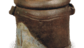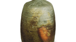 Many Bizen ware water jars have been handed down through the ages, but none have been as softly fired as this one by Tsuchiura. When wetted with water, it shows a bright reddish color, which contrasts beautifully with the grayish-black burnt skin that is produced diagonally. The figure is also large and imposing among arrow-necked mizusashi. The mouth of the nock-shaped container is tapered inward at a very strong angle, and part of it is missing as it seems to have been crushed off after a crack occurred on the mountain. The large ears on the left and right sides are in harmony with the shape of the vessel. The body is wheel-thrown and decorated with six horizontal and three vertical spatula lines, and the bottom is flat and slightly raised in the center, where the kiln mark “dried” is carved in spatula. The bottom is flat with a slight lift in the center, and the kiln mark of “dried” is carved on the bottom. It is accompanied by a lid.