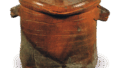 This is one of the largest of the Bizen arrow-necked water jars, and is an excellent piece that shows a somewhat old-fashioned appearance. The shape of the vessel suggests that it was made around the same period, but it is difficult to determine the origin of this piece because of the difference in position in the kiln and the effect of the flame. This is one of the difficulties in making pottery such as Bizen, and it is also the source of its endless delicacy. The ash falls diagonally on the left side, and the sesame glaze forms a scabrous grayish-blue undercoat that, in combination with the iron-brown fired surface, gives the piece a heavy texture. The flat bottom is spatula-engraved with a “-” seal, and the lid is engraved with an “X” seal. Needless to say, the lid was probably added later.