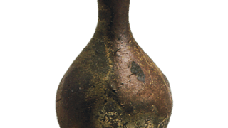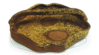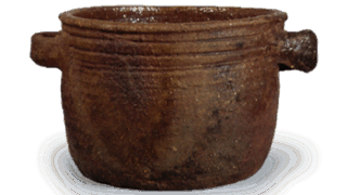 This is one of the most varied water jars of the period, with a slightly smaller overall shape and a stepped shoulder and hem. The mouth is open with a low, upright, nock-shaped mouth, and two vertical incisions are made in the ears on either side. It has a thin lid that is probably from the first time it was made, but the kiln-formed scene is very clear all the way to the lid. The maker of this pot has a horseshoe-shaped mark on the front, and it seems that he was active in the production of water jars and flower vases. All of his works are skillful and highly decorative, and he makes good use of spatula carving. He was probably one of the leading potters of the Kei Keicho period. Two sticking marks remain on the flat bottom.
