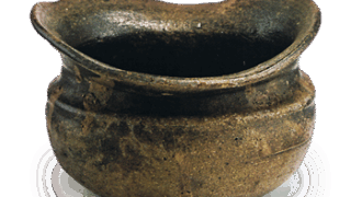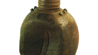 The overall workmanship is thin, and the hard, dark-brown clay rot has a glossy luster and a thick sesame glaze. This type of Bizen ware is called “Ibe-Te. There are two types of Ibe Te: those with a coated clay base and those without, but this water jar appears to have been coated.