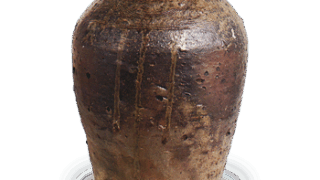 We have seen several gourd-shaped tea caddies and wakes of this style, but this is probably the most beautiful of them all. The tight body and hem are interesting, and the chamotori-like spatula-modelling on the hem tightens the overall shape. The shoulders are also spatula-trimmed, and vertical stripes have been added to the four sides of the body. The bottom is flat with an “X” mark, and the body is also spatula-engraved with an “X” and “Ya” mark. The body also has an “X” and “Ya” mark carved on the spatula. One side of the body from the mouth has a bright reddish color, while the other side is burnished to a dark grayish brown with ashes, but the clay skin is softly burned, making this a masterpiece with a deep wabi-like atmosphere.