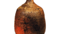 The body is gently rounded with a rounded, stroked shoulder, and the bottom is well squeezed. The body is rounded with stroked shoulders, and the body is gently swollen with a tight hem. The white earthenware with a slightly reddish tinge is soft and tightly baked. The shoulder is marked with an “e” and there is a very small amount of sesame glaze on the shoulder. The flat bottom is smaller than the body, and the bottom half of the vessel has a deep scarlet color.