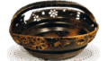This is a flat bowl in the shape of a wooden oblong plaque, which is often found at shrines and temples, with the two characters “Seiden” carved deeply into the prospective face. This is a rare example of this type of bowl, which was probably specially ordered. The decorative incision on the raised rim is sharp and powerful. The sesame glaze is applied thickly and thinly over almost the entire surface, leaving seven large and small rounded slits in the prospective area, and the sides are also covered with a thin layer of sesame glaze. The purple-brown clay and the sesame glaze blend well with each other, giving the pottery a profound color tone. It has six low legs on the four corners of the flat bottom and in the center of the long side, and two large circular imprints on the bottom. It is not clear what the characters “seiden” mean.