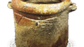 The body is triangular with a rounded shoulder, and the hem is also rounded. The body is triangular with a rounded shoulder and a rounded hem, and the bottom is flat. The three sides of the body are decorated with lively spatula carvings in a design style, and the mouth, shoulder and body are covered with a thin layer of sesame glaze, but the glazed surface is heavily shaved and the other sides are hardened.