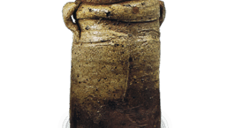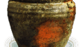 This is a particularly vivid suisashi with a kiln-turned scene. It has ears on either side of the shoulder and a shallow line in the shape of a cord running down the center of the body. Kiln marks are engraved on the bottom and under the shoulder.