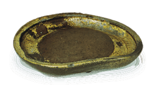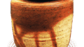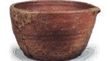 This is another fine example of a bar-tip mizusashi, and is probably the most outstanding one in its category as far as we have been able to determine. Both of these pieces have been spatula-trimmed and squeezed, but the overall shape is very tight. The mouths are slightly tapered inward, and the rims are sharply sloped. The bottom of the potter’s wheel is covered with red clay, and the wheel is clearly wheel-thrown in 11 steps. The bottom of the potter’s wheel has a kiln mark carved in spatula.