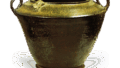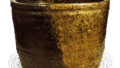This is probably an early Ibe-te piece, but the entire piece is molded rather thickly. The shape is a so-called “bird’s hat,” and it is formed in the shape of a diamond with a stroked angle. The outside and the inside of the bowl are thickly glazed, and it is burnished to a dark, blackish brown color. It is thought to be an early type of ouboshi-shaped water jar.