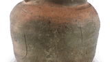 This may also be an Eboshi-shaped water jar. It is thinly wheel-thrown, with a strongly diamond-shaped mouth and a slightly square bottom. The outer surface is decorated with three spatula patterns on two sides, one side of the outer surface and the prospective surface are lightly glazed with ash, and the other side is lightly glazed with ash to form a scene. There are two rounded holes in the front and a thinly engraved inscription on the back of the bottom, but it is unclear whether it is an Ibe-te suisashi or not. It is probably a so-called “Ibe-te” water jar.