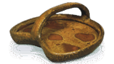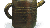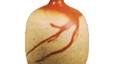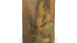 This is an excellent example of a triangular vase with a rounded mouth and a triangular body. The mouth is shaped like an arrowhead and the bottom is round and flat. The mouth and body are covered with sesame glaze on two surfaces, and the red surface has blue patches of kiln discoloration. Each side of the body has strong vertical spatula marks and horizontal spatula marks on the top and bottom. There are traces of kanzuke holes filled in on three sides of the shoulder.
