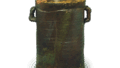 The mouth has been distorted and interestingly changed during firing. The white part to the bottom of the body is covered with sesame glaze on one side and some parts have turned gray, while others have tightened to a dark brown. The bottom has a large spatula engraved seal, the back is decorated with a crest, and the front is filled with a hole for a kanzuke (a metal bowl with a hole in the middle). On the back of the lid of the box, Jyoshinsai inscribed “Hisen Hanabirazu, left, Futami,” (stamped with a flower seal).