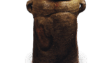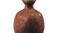 This small, horn-shaped sake bottle has a horn-shaped mouth and a richly swollen body, and is now also used as a sake cup. It has small ears on either side of the shoulder, but the overall appearance is straightforward. It seems that something was covering the mouth, and the neck is plainly burnished, with ash falling from the shoulder to the hem of the body, and one side is burnished red. There is a kiln mark on the shoulder, but it is not clear, and the kiln mark is carved on the flat bottom.