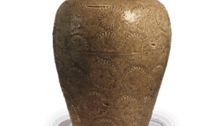 Although this jar is formed rather thick overall, the mouth with a raised steamer is clearly modeled after a Lu-Song tea jar. The stroked shoulders have ears on all four sides, but three of them are missing. There is an engraved inscription on the bottom, “Ugetsu Yoshi Hi, Tenbun Nisai, Chikuhiko Tsuchimon,” which is a valuable document that suggests that this type of Bizen tea jar was already being fired in the early part of the Tenbun era (710-794). It seems to be one of the earliest Bizen ceramics with chronological inscriptions, and in a broad sense, it was fired as tea ceremony utensils. The bottom of the bowl is covered with ash, and the bottom is reddish brown.