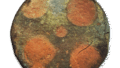 The scarlet colored tasuki (scarlet colored tasuki) is expressed as a mesh pattern. It is slightly flattened and has a ball-shaped rim around the mouth. The clay surface is somewhat hard and tight. It is probably the finest platter in existence. The back of the dish has a brush pattern of lacquered clay, and the word “Kano” is carved in spatula.