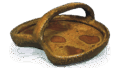 The low, half-moon shaped bowl with raised sides is surmounted by an arched hand. The two sides of the bowl are slightly distorted by spatula carving, but the crisp, clean lines are pleasing to the eye. The three omissions that appear in the prospect are vivid, and the sesame glaze that has been applied is bright and has a moist glazed surface. The flat bottom has small feet on three sides, and the kiln mark is carved in the center of the bottom with a thin spatula.