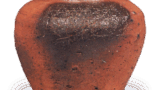 The flat mouth rim is stepped and the rise is slightly deep. Seven red omissions remain on the prospect. The hand and mouth rim are covered with a yellowish sesame glaze, and there is a thin layer of sesame glaze on the prospective view. A kiln mark is stamped on the bottom.