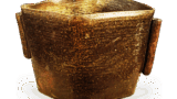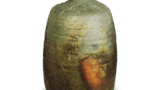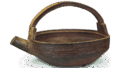 This flat kataguchi-guchi, with the mouth held inward, is a rare example of this type. It is thought to be an old piece of this type of kataguchi-guchi. The exterior is coated with a sesame glaze, and the prospective ware has been fired to a grayish-brown color. It appears to have been fired under a submerged firing, and there is a circular hole on the bottom where the sesame glaze has fallen. A kiln mark is spatula-engraved in the center of the bottom.