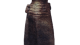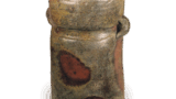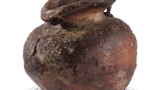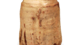 Like “Fuyo,” this piece is molded in a thicker shape, with a stroked square shape from the mouth to the base of the body, and has a ring around the base of the sloping neck. The bottom of the thickly rounded vessel is cracked, and the back of the vessel is unevenly burnt from the mouth to the shoulder, and the body is also roundly burnt in red. The front of the body is covered with a shallow young grass-colored ash glaze from the square to the body, and the lower half of the body is thickly glazed with a green beadlo glaze under the dark purple-black charring that has partially accumulated at the base. This vase also has a hole at the base of the neck that has been filled in.