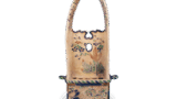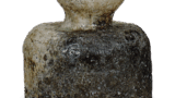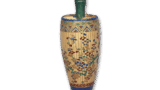 This vase has an unusual shape with square ears on the left and right sides of the mouth, which is commonly referred to as “Tang Inu-mimi. The mouth rim is rounded inward, the shoulders are rounded, and the body is slightly open at the base, which is supported by a solid base. The body is slightly open at the base with a firm base. Deep spatula carvings undulate in a mountain-like pattern under the shoulders, and shallow vertical spatula lines are clearly marked in one or two stripes on either side of the body as well as one thick vertical line on the back, as if made with a fingertip. The front is heavily covered with ash, the top is burnt dark brown, and the lower left half has a dark greenish-blue glaze, reminiscent of a mossy rock. The back is unglazed and has a light brown burnt surface, with blackening only around the base. The bottom is flat with cracks in the kiln. There are traces of a hole in the shoulder where the potter’s wheel had been filled.