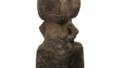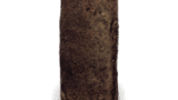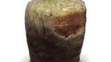 This is another unexpected form. The long neck rises from the flat, boat-shaped body, which protrudes on both sides, and the mouth is stepped, as in Muromachi period vases. The flat bottom is oval, and the front is covered with a thick layer of ash from the mouth to the body, giving it a moss-like appearance, while the back has a light red burnt surface. The right half of the body has a soft, tightened clay surface with two cracks in the kiln. The top and bottom of the neck is decorated with a five-stripe comb pattern and two vertical stripes on the four sides. The inscription “Choro” probably reflects the shape of the slim neck. This is one of the oldest Iga Hanayaki vases of the Momoyama period.