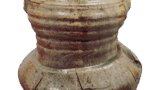 This flower vase is in the shape of a turnip with a citron-shaped mouth, and the body is decorated with a single stripe of rings and a five-stripe vertical spatula around the citron-shaped mouth. This piece shows that Iga ware was also produced in the same manner as Bizen ware, i.e., with a flower vase copied from a Chinese style. The ash glaze is applied from the mouth to the bottom of the vase, and some of the glaze has a blackened, burnished surface. The back is slightly reddish with two streaks of blue beadlo glaze. The base is unusually low, perhaps carved in the manner of a celadon vase. There are traces of sticking near the base. It once belonged to the Akahoshi family.