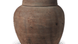 While most leather-bag-shaped vases usually have an outer lower rim, the bottom of this vessel is made to warp inwardly. Although the bowl shape is the same as that of a bowl turned upside down with the mouth rim bound together, this shape may have been created by enlarging the bulge of the body. The bottom of the bowl is shaped by scraping. The typical skin stitching is indicated by a three-sided band on both sides and at the top of the center, but the bamboo tube design is stamped not only on the band but also on both sides of the band in a rather messy manner. On the opposite side, there is no buttress, and only the bamboo tube is used to form the stitching. The neck is similar to that of a narrow-necked bottle with a two-tiered rim, and there are two concave lines on the lower half. It is a work with a rich local flavor.