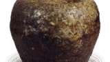 In Shigaraki, this type of vessel has been called “onioke” since ancient times. Originally, this type of container was probably created as a ramie container for spinning ramie (hemp) as a miscellaneous tool, but it is thought that it was used as a tool for making a decorative object and was made into a water container around the late Muromachi period (1333-1573). It is generally referred to as Shaogu Shigaraki because it was made in the Shaogu period. The oval-shaped mouth is distorted and stepped, then straightly tapered toward the base, and the bottom is flat. The brownish-brown clay skin is covered with numerous feldspar grains, and the outer surface is covered with an ash glaze. It is considered to be the finest onioke mizusashi of this type.