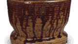 This is a typical example of a Shigaraki arrowhead container, but it is slightly shorter and has deep spatula carving on the upper part of the body. The body is decorated with thin vertical lines at equal intervals, which are thought to be in the shape of a tub. The clay skin is brown and hardened, and the mouth and front are covered with an ash glaze of the color of decayed leaves. The center of the bottom has been cut off in a shallow rounded shape, and the surrounding area has been made to look like an elevated platform. On the back of the lid of the box, there is a calligraphy of “Shigaraki Yatogokuchi-Mizusashi, Shinsaiza (Hanashoshi)” by Ryozai Soza, the ninth generation of Omotesenke. On the inside of the box, what appears to be a kiln mark “-” is carved in spatula.
