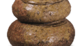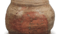 This is a deep, one-sided vessel with the mouth held slightly inward. It has a small spout with an ash glaze on one side and ash on the prospective side, and the clay surface is reddish and softly fired. It is not a mizusashi, but rather a young utensil.