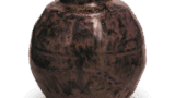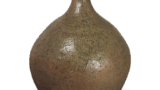This tea caddy is shaped like a smaller version of a mountain rut jar. It is an excellent piece with a vivid landscape. The low, upright mouth is slightly warped at the edges, the shoulders are tight, and the base of the body has a broad surface. The texture is very similar to that of “Ikuno” with a fine texture. The interior is unglazed and has a fine wheel-thrown surface with a faint ash fall.