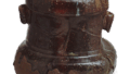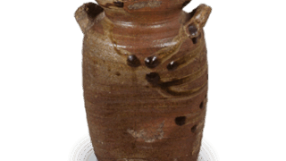 This wide-mouthed cylindrical pitcher has a potter’s wheel with a strong wheel-thrown pattern on the body. The entire surface is coated with dobe and covered with ash glaze, but some parts show white sea squirt glaze variations. It is probably from the early Edo period.