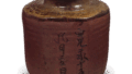 Asakura pepper is a specialty of Tamba, and many hexagonal pots inscribed with the characters “Asakura Sansho” were fired in the early Edo period as containers for the pepper, and are widely known as a specialty of Tamba ware. This jar is one of the representative examples of such Asakura sansho jars. It has a tight shoulder, a ball-rimmed mouth, and a hexagonal body, all in the same form. The front is engraved with the characters “Asakura Sansho. The mouth and the bottom of the body are covered with an ame glaze, while the shoulders and a part of the body show sea squirt glaze.