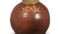On the back of the box lid, Omotesenke VI Kakusai Haraso wrote “Tanba Yaki Tea Bowl inscribed Okuri Kakusai (Hanaseki)”. It is a tea bowl with a slightly protruding mouth and lowered base. The entire surface is covered with a purple-brown glaze, but some parts are blackened. There are two gold repairs on the surface. It was handed down to the Fujita family.