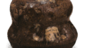 This tea caddy has a shoulder-jointed shape with a ball-shaped rim, but the lower part of the body is stretched tightly to form a so-called “dojikata” shape. The bottom of the bowl is tapered and the flat bottom is cut with an itokiri (ito cut). The shape of the body is lightly covered with ashi-washi in the shape of a sesame sleeve. The origin of the inscription “Shokage” is not clear.