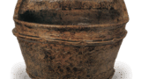 This is a large tsukuri with a richly swollen body. It is also decorated with a scratch design by combing, and has a thin layer of natural glaze from the mouth to the body. The clay surface is slightly reddish. The kiln mark “-” is carved in spatula on the shoulder. The molding was done by cord making and sumac finishing as shown in the previous figure.