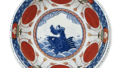 This bowl is decorated with an Araiso motif, or carp jumping over the waves, in underglaze blue inside the prospective circular window.