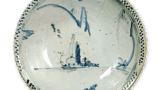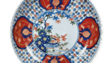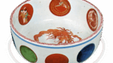 This is a large deep bowl with a slightly open guard rim, and the mouth is cut into a 29-petal chrysanthemum shape. A bird is placed on a rock in the center of the circular window and clouds are arranged in the sky. Around the window is a peony arabesque design with flowers on all four sides, and a simple twenty-nine-petal design with thin lines, which is also drawn on the outside. The color of the underglaze blue is rather dark, and a bluish transparent glaze is thickly applied over it. The glaze is rough in some areas, but melts smoothly over the entire surface. The small size of the base in comparison to the size of the mouth is also a remarkable characteristic of large early Imari Sometsuke bowls. A similar large chrysanthemum-shaped bowl was excavated from the Hyakumon kiln, so this bowl is thought to have been made at the Hyakumon kiln.