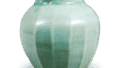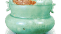 This is a purely celadon porcelain water jar. The unique shape of this vessel, with its wide mouth and taut body, seems to have been inherited from the Momoyama style. The body is covered with two thick lines of carving, and rough line patterns are applied under the shoulder and on the body. The mouth and body are covered with a band of cinnabar glaze and celadon glaze. The cinnabar coloring is truly brilliant, and the celadon color is also quite vivid. The cinnabar coloration is truly brilliant, and the celadon colors are quite vivid. Yamashita Sakuro estimates that these pieces date from the Kan’ei period.