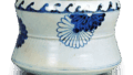 It is said that water jars with a tightened body were relatively popular, and are often seen among early Imari Sometsuke sui-jisimi. The body is slightly tightened, the waist is rounded, and the base is carved out to a large size. The upper part of the body is decorated with willows, flying birds, and a cloud-like pattern. Yamashita Sasuro speculates that this cloud-shaped pattern may be a dragon pattern unique to Imari, but I think it is a variant of the “Yundo” pattern found in Chinese blue-and-white porcelain. Incidentally, dragons did not appear in this abbreviated form until the 18th century. The body has windows on three sides with a pine, bamboo, and plum design inside, and the spaces between the windows are filled with cloisonne enamel designs. The cloisonne design is large and spacious, and has a style typical of early Sometsuke ware. The date of production is not clear, but it is thought to have been made around the Kan’ei period.
