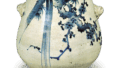 This mortar-shaped container has chamfered shoulders and a floating pattern on the body. The shoulder is decorated with a wave pattern, and the body is decorated with chrysanthemum patterns in underglaze blue and line drawings. The sturdy shape of the vessel has a sense of volume and shows a style similar to that of kosotsuke. This is one of the finest early Imari Sometsuke suizashi.