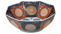 This Dokuraku-shaped bowl, with the character for “Kotobuki” (longevity) displayed within a prospective circular window, is one of the most prized of Imari ceramics. The inside has four lozenge-shaped windows with eight treasures inside, and the outside is brightly painted with peony arabesques in gold and green on a red ground. The outside is brightly painted with peony arabesques in gold and green on a red ground. This is one of the most elegant and graceful Imari ceramics. A double circle in the base is painted in underglaze blue, and there is a single mark in the center.