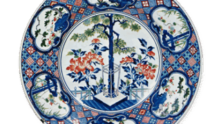 This is also a twelve-cornered bowl, with a cherry blossom design in the center of the expected circular window, weeping cherry blossoms on two sides and plum branches on two sides within a four-sided cherub-shaped window, and arabesque design on a red ground in between the two windows. The outer window is decorated on three sides with arabesques in the style of arabesque with weeping cherry blossoms in the space between. The words “Fugi Choshun” (wealth, beauty, and longevity) appear within a double circle on the inner part of the high pedestal.