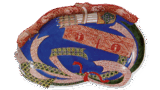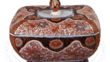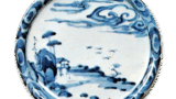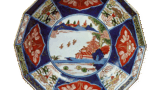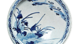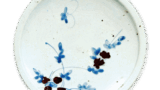 This bowl-shaped deep bowl has a rough design of peonies within a circular window in the center of the mouth, and is decorated on the three sides with a design of boxwood, fukushikan, and peony branches. On the inside of the stand, the inscription “Made in the year of the Daming Dynasty” is written in a rather rough manner.