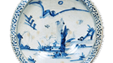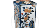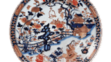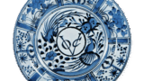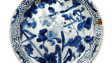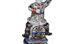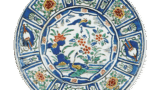 This dish has an open mouth with an edge bow, and a unique floral design is depicted in the center of the expected area. The outer surface is covered with chrysanthemum arabesques. On the high stand, an inscription “Made in the year of Taimei Seika” is written in a double circle, which is rare for this type of mold.