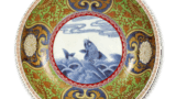 Like the plate with the bow-breaking design, this is a representative example of the variant type of dish. This dish is commonly called a princess dish because it depicts a woman dressed in juni-hitoe (twelve-layered kimono). The basic pattern is the same on both plates, but there are differences in the details and color scheme. The outer surface of each piece is covered with fine arabesque patterns, while the outer surface of the stand is decorated with a comb pattern and the inscription “Fugi Changchun” is written inside the stand. These pieces were probably made at about the same time.