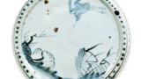 This tray was probably originally made as a tray. It is extremely well made, with peony arabesques in gold, silver, and red on a blue-glazed ground around the tray, and floral arabesques on the reverse side. The low stand is also covered with arabesques in underglaze blue, and the color of the underglaze blue is dark and vivid. There are three marks inside the base. This is the largest of the long axis trays.