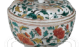 A piece exactly like this one is in England, and it is clearly exported to Europe before the 11th year of the Kanbun Era, since the year 1671, or the 11th year of the Kanbun Era, is written on the metal fitting attached to its mouth. It was the former Director of the British Museum’s Oriental Department, Thome Jenyns, who presented this piece, and since the style is similar to some of the pieces traditionally referred to as Ko-kutani, Jenyns concluded that Ko-kutani was fired in Arita. In this sense, it is an important material for speculating on the export porcelain of the first half of the Kanbun period, and also for considering Ko-Imari and Ko-Kutani. This piece was recently imported from Europe, and from the shape of the vessel, it is clear that it was made to order from Europe. The body is decorated with cloud and plum bowl patterns, with fine line-drawn patterns in between. The red lines on the shoulder and hem are the most distinctive feature of this type of Ko-Imari.
