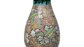 This large, imposing sake cup is made of the same material as the one shown in the previous figure. The base is exactly the same as that of the previous piece. The neck and shoulders are covered with several red bands, and the hem is also covered with a red band that extends to the base. The body is decorated with a large iR bay pattern, and the ground is decorated with ume bowls and fine oblique line drawings. The ground pattern is exactly the same as on the previous piece, and it is thought that this piece was also made during the early Kanbun period.